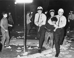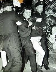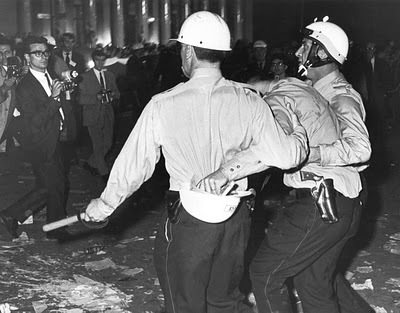 Whoever looks young, hippie-ish, countercultural, is grabbed by the police, thrown to the ground, beaten with batons even on the ground. Three or four officers grab arms and legs and drag the person through glass-strewn streets to a police van, all the while clubbing the person as they go.