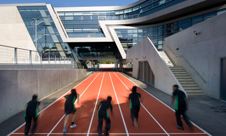 The Evelyn Grace Academy was created to house four separate schools in Brixton. The identity of each school remains unique, but the shared spaces, including a vibrant red track that literally runs right through the academy, connect each school to the others.