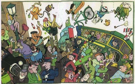 spectacularly chaotic crowd scenes he enjoys creating. I think this is part of their appeal to kids; it's a reward and a surprise for paying attention – a slightly perverse I Spy. In this scene from The Beast of Monsieur Racine, a man has a rather painful-looking injury from the umbrella embedded in his head, and the gendarme beside him has lost a hand.
