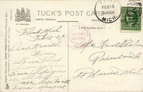 My mother-in-law died a year ago yesterday. When she was alive we would frequently go visit her at the Mennonite nursing home. There we would help her and some of the other residents eat their meals. This was sometimes a difficult thing to do – but always a tender /touching act of love. I distinctly recall one man saying quite loudly over the din of dinner "perogies are nothing to laugh about" to one of his table mates. I can only say I agree with him. I also know that the sausage is something to be taken seriously (esp Cottam sausage from down near Leamington). This next unusual card was mailed February 13 1909 from Flint Michigan. It's a Raphael Tuck and Sons postcard – "Loves Tributes" Series no 5. (Tuck cards are clearly marked on the back of the card).