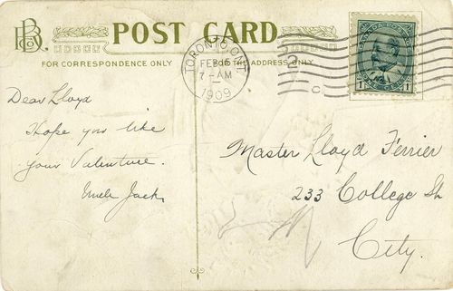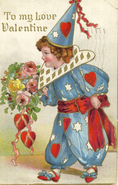 Valentine's Day seems to be a contest of charming images all vying for attention. This young man in a clown costume with hearts and stars has a very beautiful bouquet of flowers. It was mailed in Toronto to "Master Lloyd Ferrier" of 233 College Street in Toronto in 1909 from his Uncle Jack.