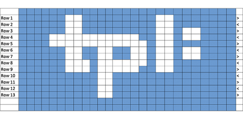 Step 4: Starting from the CO edge of the scarf, count up 20 STS. Using the chart below and starting with row 1, add the pattern to your scarf using the duplicate stitch technique. To do this, thread a tapestry needle with white yarn (SC) and then stitch over the top of existing stitches to create the TPL Logo pattern on your scarf.