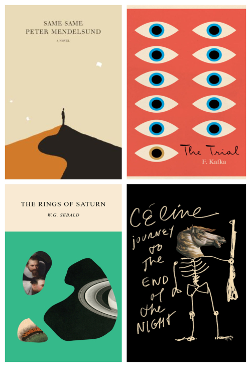 Book covers for Same Same by Peter Mendelsund, The Trial by Franz Kafka, The Rings of Saturn by W.G. Sebald and Journey to the End of the Night by Louis-Ferdinand Celine.