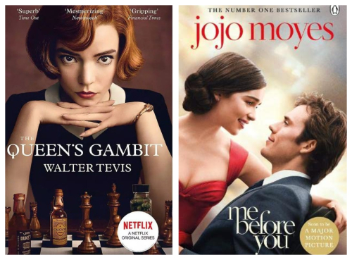 Conversely, the book covers for The Queen's Gambit by Walter Tevis and Me Before You by Jojo Moyes emphasizes the faces of the actors from their movie/television adaptations.