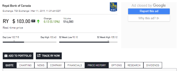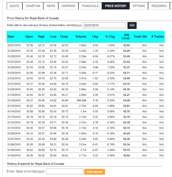 If looking for historical daily stock prices for companies trading on the Toronto Stock Exchange, type in the company's ticker symbol in the Get Quote search box.
