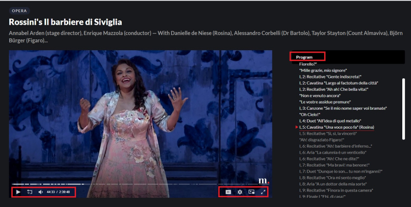 Subtitles are available for some performances, documentaries and master classes. If available, click on the Close Captioning [CC] icon in the toolbar to see the list of subtitle language options.