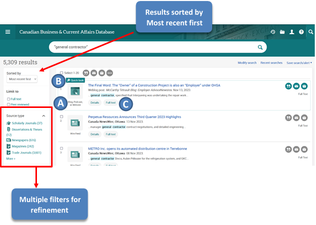 Your search will bring up results appearing from different Source Types (books, trade journals, newspapers, magazines, scholarly journals, etc.)