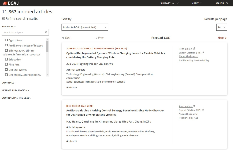 The Directory of Open Access Journals (DOAJ) searches full-text scientific and scholarly articles from Open Access journals within its directory. It is also a directory for researchers to find the most appropriate Open Access journal to contribute to. To be included in the DOAJ, the journal must abide by the Budapest Open Access Initiative's definition of Open Access. DOAJ is maintained by Infrastructure Services for Open Access (IS40A) who aims to promote Open Access journals to increase their usage and impact around the world.