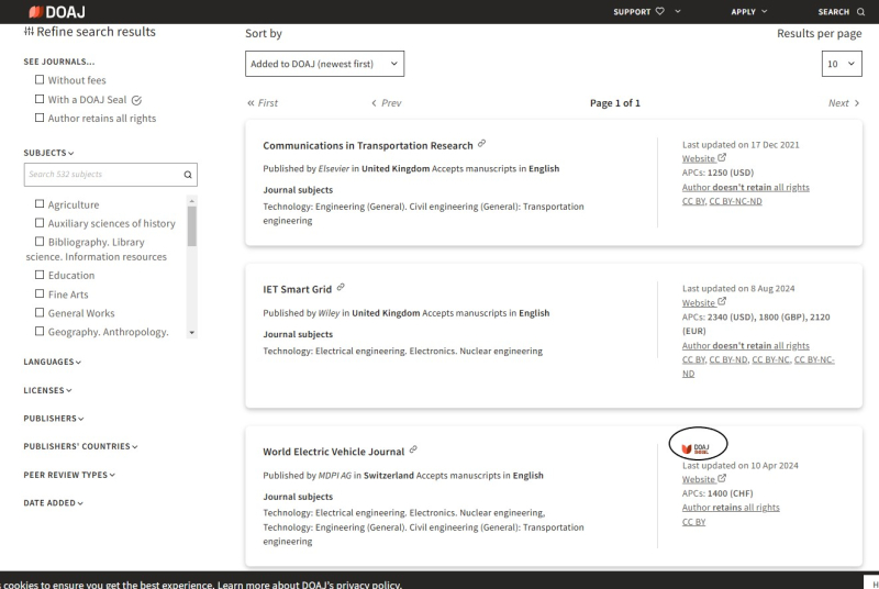 -DOAJ Seal, journal's last update, website, publishing price, and author's right appear on the lower right end of each result.