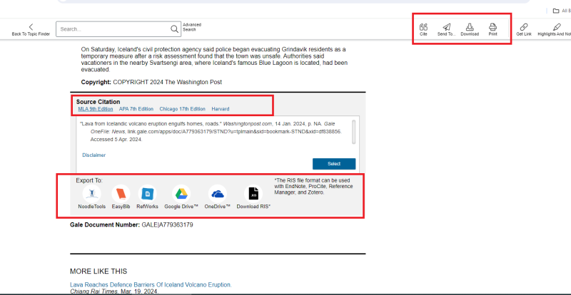 Use the top right menu to see other Gale Resources through Title List, keep track of your Search History, get a web link to your current page through Get Link, and Highlight text.