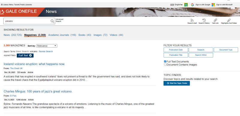 The search bar on the home page allows for basic keyword searching through the database. You can use the top bar to filter what news sources you’d like to see results from. Gale OneFile: News will default to magazine articles. You can use the side panel to filter your results further.