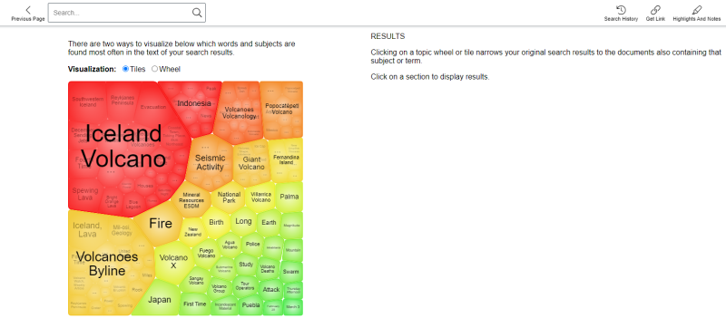 Topic Finder takes the titles, subjects, and approximately the first 100 words from a subset of your top results and feeds them into an algorithm. Keywords shown in the graphics are those found most often in the text with your search term.