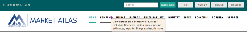 Market Atlas has two persistent menus that appear on the Home Page and at the top of any Market Atlas page. The top menu provides access to a Company Search box and Help resources. Below this is the main menu for Market Atlas. This includes links to the Company, Filings, Ratings, Sustainability, Industry, and Reports sections. Hover over the menu names to get a brief description of the information available in that section.