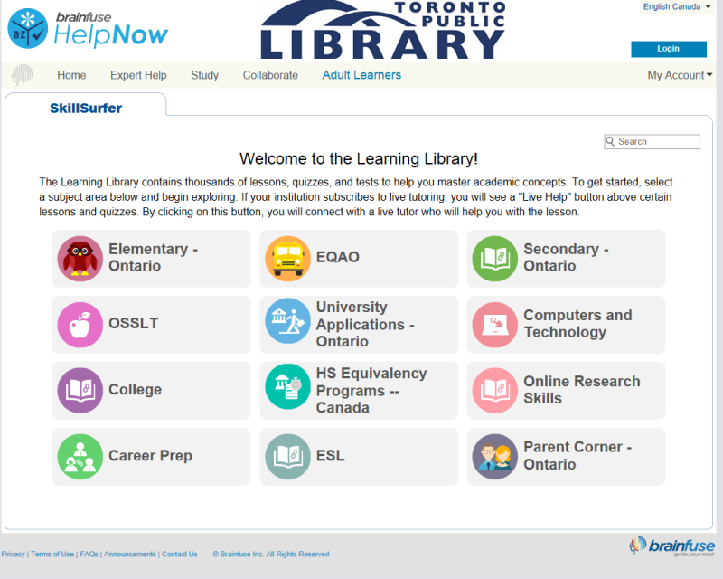 SkillSurfer offers a variety of lessons, quizzes and tests that can be taken at your own pace. It includes practice tests to help you prepare for standard tests such as EQAO, the Ontario Secondary School Literacy test or the Academic and Career Entrance Program. It also includes practice tests and quizzes for ESL and Microsoft Office applications at the beginner, intermediate and advanced levels.