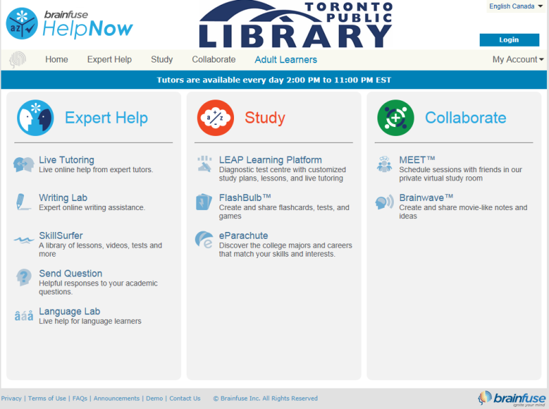 Brainfuse offers live online homework help daily from 2 to 11 p.m. excluding holidays when the library is closed. Professional tutors are available to help with math, reading, science, social studies and language arts for students in grades K to 12.