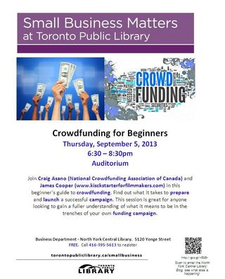 One of my colleagues recently wrote a crowdfunding blog for the library's Business & Personal Finance blog you can read it for some more information. Also, the Business department will be hosting a program next Thursday, September 5, 2013 to kick off our Small Business Matters series which runs from September to December.