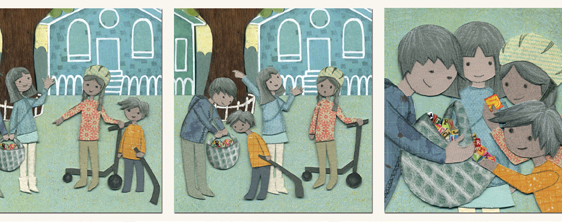 Gutierrez’s comic-strip panels give a cinematic feel to the adventure. In the backyard, the children pick “T”s dangling from a tree and gather “N”s from a garden. At the market, cut-paper collage letters in different typefaces, fonts and colours are piled high on shop counters. When the pair goes in search of the ever elusive letter “Z”, their quest even takes them to the top of a mountain. At the end of the book, the boy and girl are pictured at an easel, animatedly spelling and retelling their story.