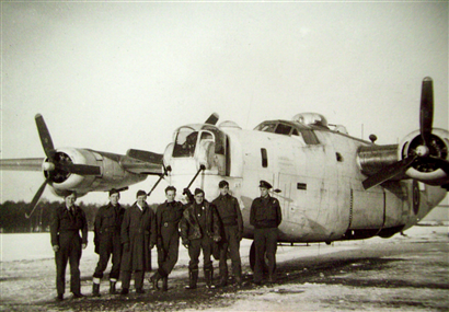 Pilot Officer Sam Garnet (second from left) stands with fellow crew members and their B-24 Liberator.