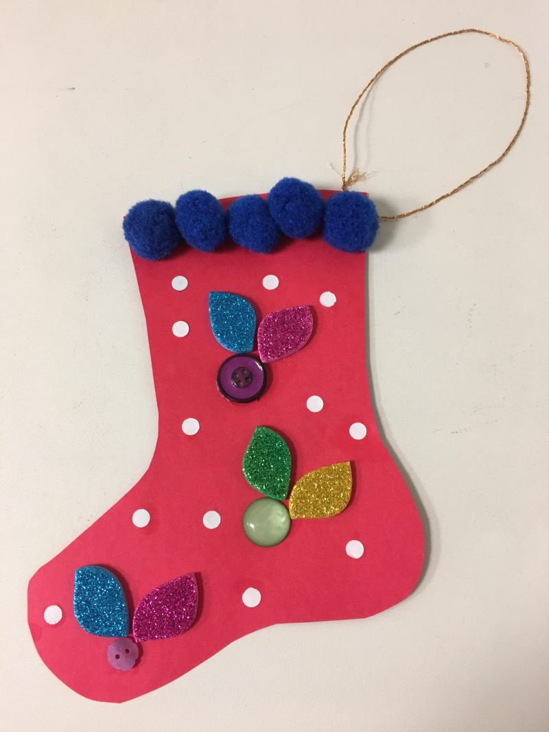 Lastly, have them decorate the front of the stocking however they like. This is their time to be creative! Don't forget to poke a hole in the top right hand corner and tie a ribbon through the hole.