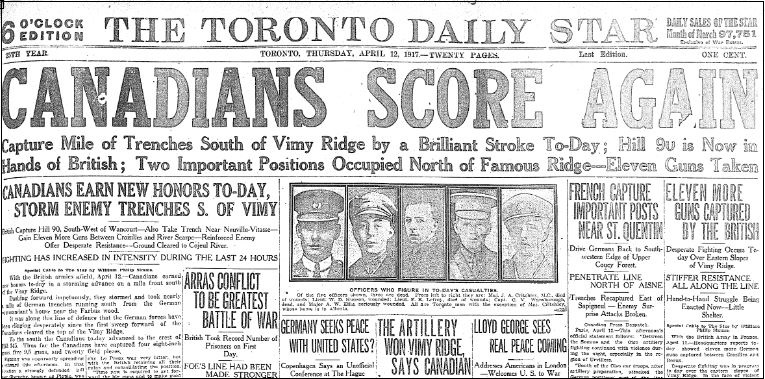 In Canadian history, the Battle of Vimy Ridge stands as one of the most celebrated and mythologized combats of the Great War. It was initially hailed a great victory, a turning point, and a celebration of Canadian nationalism. “CANADIANS LEAD IN TRIUMPH” said the Globe and Mail in huge type on April 11, 1917, and reprinting from the New York Times: “April 9, 1917 will be in Canada’s history one of the great days, a day of glory, to furnish inspirations to her sons for generations.” That same day, the Toronto Star headline said: “Canadians Took 3,600 Prisoners on Vimy Ridge” and in a front page article: “Berlin Expert Says Battle Will Be Decisive.” On April 12, the Star trumpeted “CANADIANS SCORE AGAIN.”