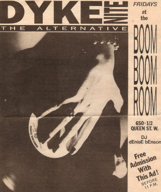 Denise Benson is a DJ, radio host and author of the 2015 book Then & Now: Toronto Nightlife History. From 1991 to 1993, Benson was the DJ and promoter of Dyke Nite at The Boom Boom Room on Queen West. The weekly night featured film screenings, live music, readings, community fundraisers and hot tub parties. Benson also performed at this 1991 benefit event at The Cameron House in support of local bands The Matriphiles and Random Order after a robbery at the bands’ shared studio space. The bands were part of Toronto’s thriving underground LGBTQ2S+ music scene of the early 1990s.