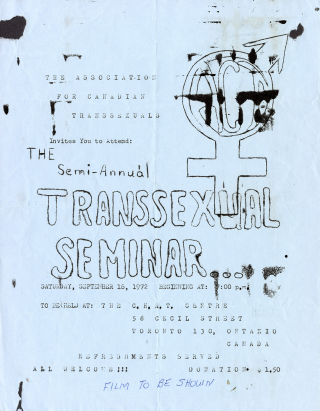 The Community Homophile Association of Toronto (CHAT) Centre opened in 1972. This poster advertises the semi-annual "Transsexual Seminar" organized by The Association for Canadian Transsexuals. CHAT was the hub of Toronto’s LGBTQ2S+ community in the 1970s. These seminars were an important resource for the transgender community to share their knowledge and experiences, gain information, connect with other community members and navigate the transition process.