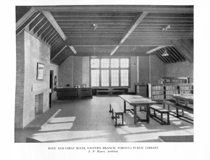 “East Toronto’s new Public Library, at Main and Gerrard streets, was opened last night for the adult population, but the children will have their initial function on Saturday. The building is of brick and raftered stucco, and, while the lower floor, for the grown-ups, is pleasant, the upper floor…the children’s own, is a near approach to the ideal. Miss Margaret Wainwright is children’s librarian and Miss Redmond will look after the serious literary needs.”