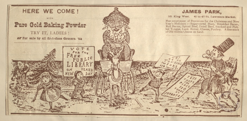Illustration of Santa riding on sled with children holding signs to vote for a free library alongside an ad for baking product and a notice of a meal in James Park