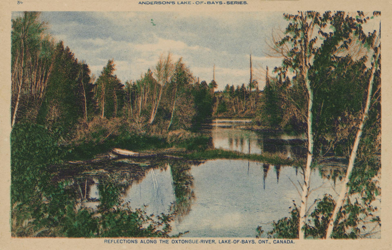 Reflections along the Oxtongue River, Lake of Bays, approximately 1925. As with so many other postcards, the copper engraving for this postcard was likely lost when the business in Germany was shut down. View on Digital Archive Ontario.
