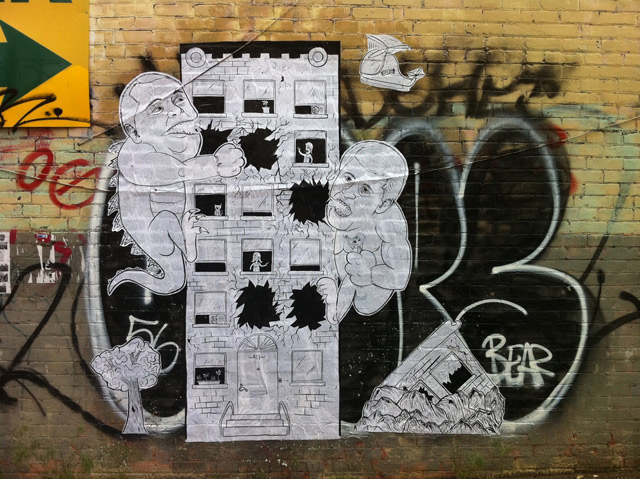 Alleyways once alive with colour have been sterilized with fresh coats of paint. Even city commissioned murals have been removed. Joel Richardson's Suit Stencil, which was once located on an underpass near Dupont and Lansdowne, was erased by the city because it was "unauthorized, un-commissioned, political and may have [negatively] referred to (Prime Minister) Stephen Harper.”