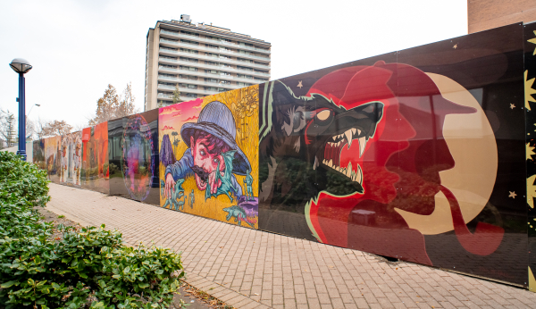 The mural is the result of over two years of collaboration between the partners, in consultation with the community, and features the work of 15 StART artists. Artists were asked to draw on Conan Doyle’s voice, using materials from the collection as inspiration. The mural explores the moods evoked by his writing styles and applied to characters, motifs, metaphors, shapes and colours.