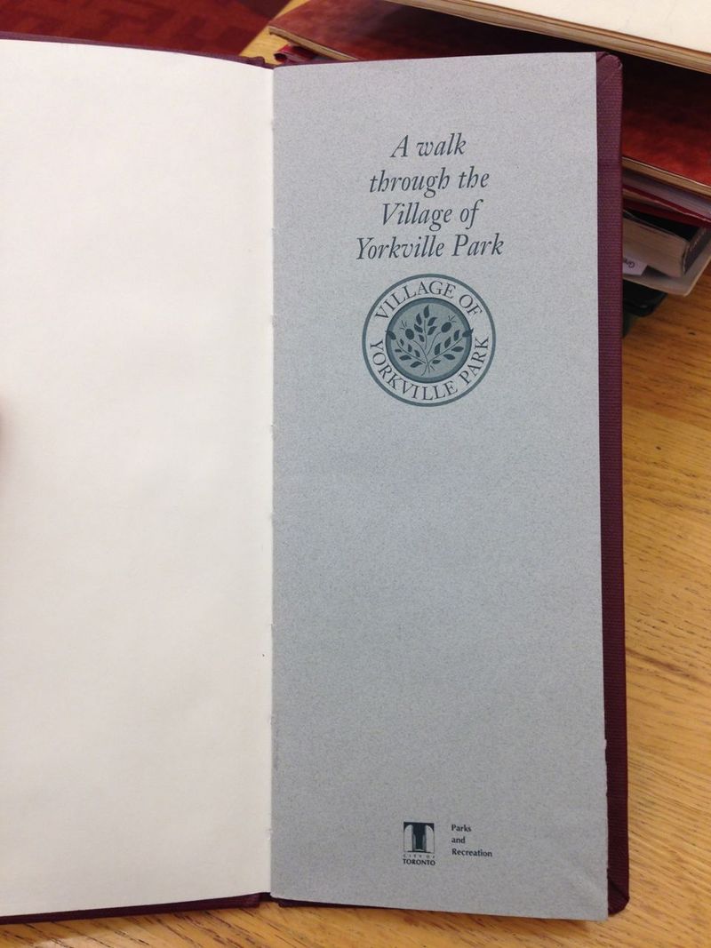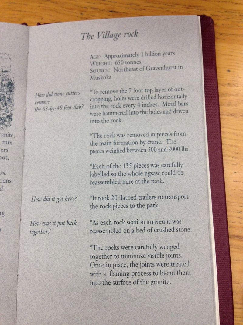 Hard bound for posterity, the original pamphlet produced for the Village of Yorkville Park reveals some great information on how the park came about (subway line construction required tear downs, resulting in a parking lot for many years), interpreting what's there now (the park is divided along former lots and each section represents a different Canadian landscape) and some neat facts, like where the big rock came from and how they got it to Yorkville. I would like to go find the hole in Muskoka where it came from as I've always pictured a local standing by it, shaking a fist at the air yelling "Toronto!"