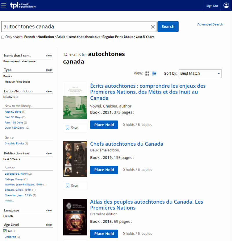 You can also find French materials by searching our website with French keywords. Narrow down your list of titles by using filters like date of publication, branch, subject, etc.