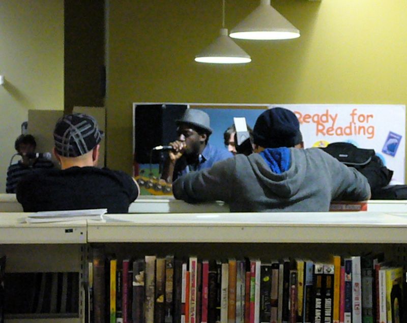 Walking past College Shaw Library last night, this is what passersby saw when they looked in the window. Inside, straight from the kids' area, Grand Analog was playing their hip hop, soul, reggae beats to a very happy crowd. See what the Torontoist has to say about the night of Stacks of Tracks (In the Stacks)!