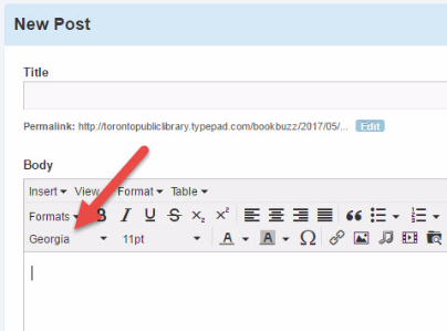 - The library’s online typeface “Open Sans” will automatically be applied to your blog post once it’s published. You do not need to change the “font family” from the Rich Text toolbar. The font will default to a selection from the menu, usually Georgia, Times New Roman or Trebuchet MS in size 11 pt. "Open Sans" is not part of the list. It does not matter what the default font is – just continue to type!