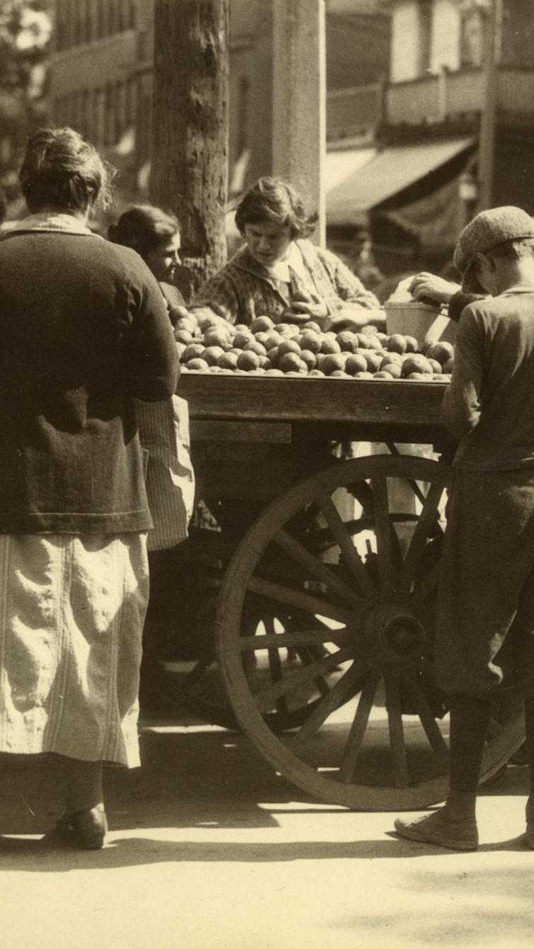 This cart was part of the weekly market held on Thursdays at the time. Kensington Market went on to change from a largely Jewish merchant community in the 1940s to a thriving multicultural community hub in the 1990s. (See full image on Digital Archive.)