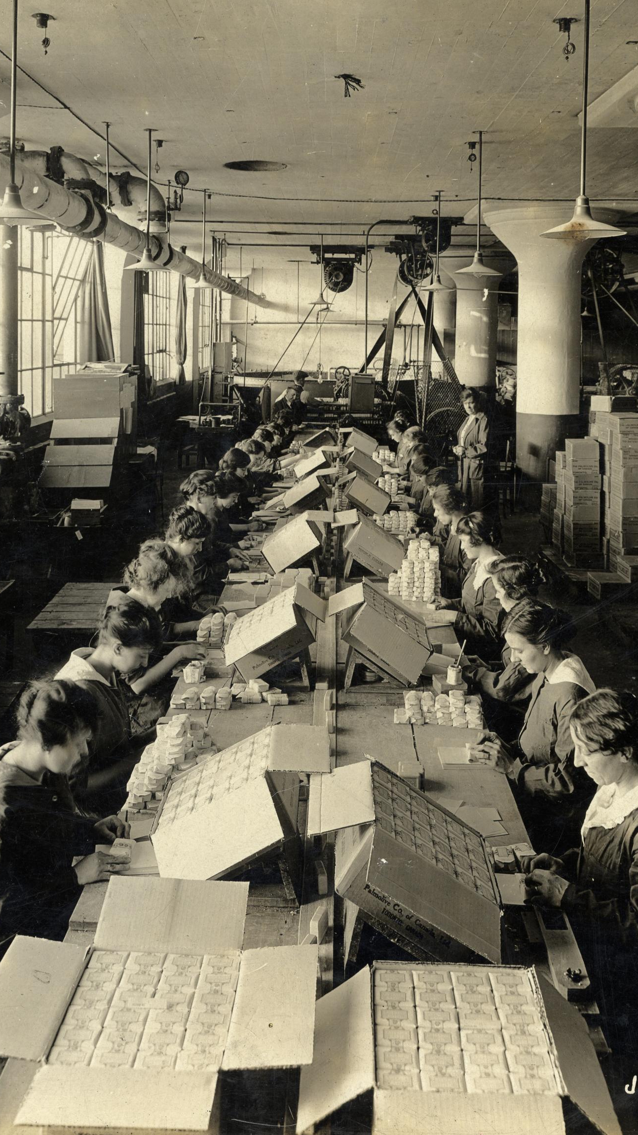 Here's a peek into a facility for consumer goods company, Colgate-Palmolive. This location was at Colgate Avenue and Carlaw Street. At the start of the 20th century, Palmolive was the world's bestselling soap. (See full image on Digital Archive.)