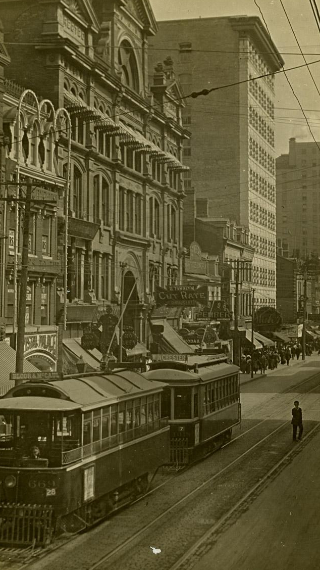 Toronto’s first electric streetcars date back to 1892. Before then, streetcars were pulled by horses — a service that ended in 1894. Electric streetcars were less costly and were able to travel across areas with greater inclines. (See full image on Digital Archive.)