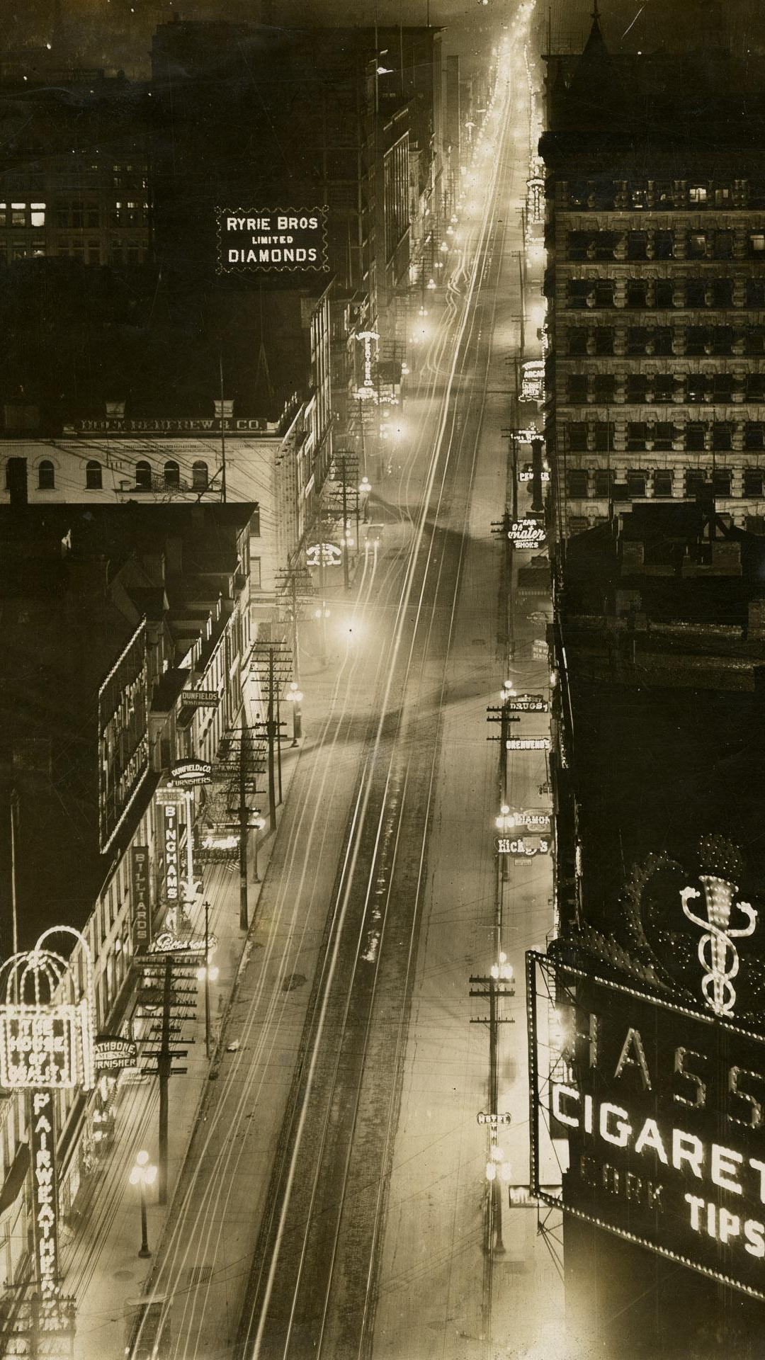 Yonge Street is the city’s gathering place for parades, street performances, festivals and protests. The street was named by Ontario’s first colonial administrator, John Graves Simcoe. He named it for his friend Sir George Yonge, an expert on ancient Roman roads. Ironically, Yonge never visited Canada. (See full image on Digital Archive.)