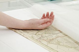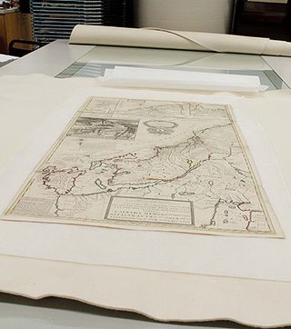 Acid-free Japanese paper is affixed to the broken edges and tears of the map using wheat starch as a binding agent.