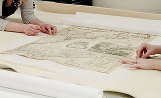 A dry sponge is used to clean centuries of grime off the surface of the map.
