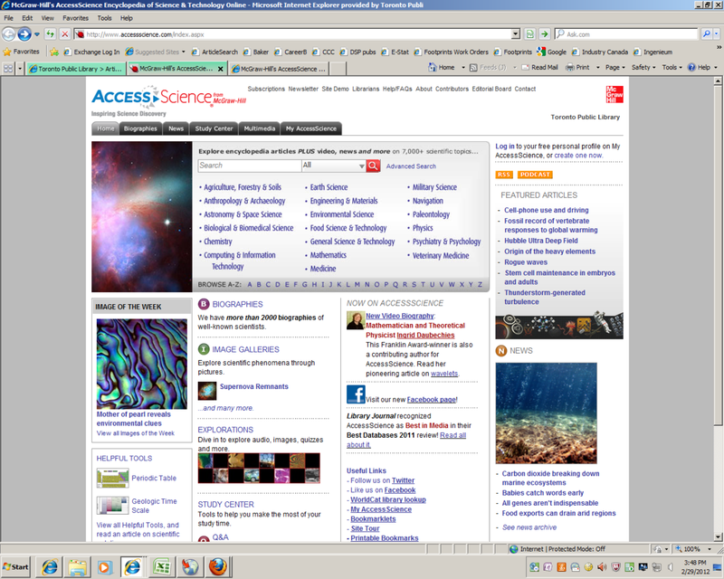 Winner of Library Journal's Best Databases 2011 and Best in Media, AccessScience (McGraw-Hill Encyclopedia of Science and Technology) is a great online encyclopedia that is simple to navigate and designed especially for students.