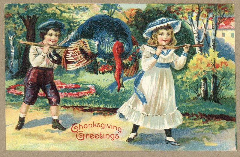 Below find a selection of postcards from the collection celebrating Thanksgiving – they're all circa 1905-1910 – some are mailed and others unused. They are chromolithographs and several are embossed so they have a slight three dimensional feel in the figures/animals. If you're interested in talking real turkey you would likely enjoy another Library blog post on Thanksgiving cooking.