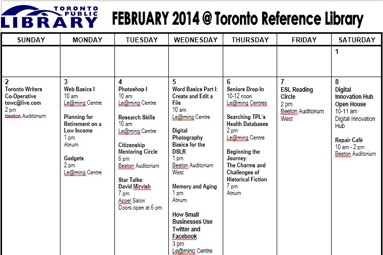 On February 8, a new gallery show on musical Toronto, "Coffee, Beer and Mosh Pits" opens in the TD Gallery. The brand new Digital Innovation Hub has an Open House on February 8th. If you miss it, come for the second one on February 26.