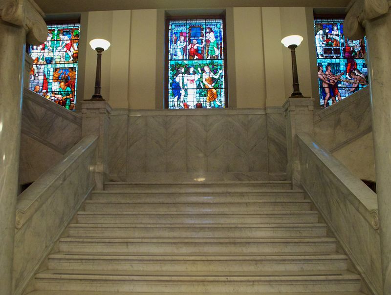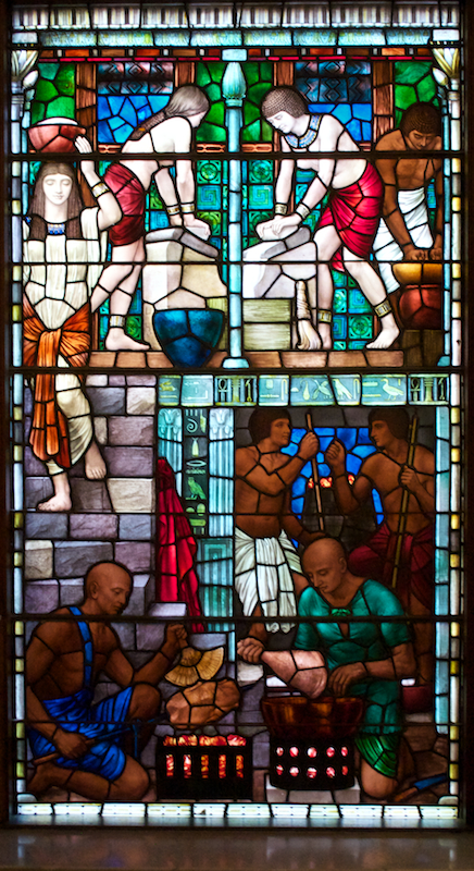 Originally Lillian Massey was thinking to commission windows with an ancient Greek theme in line with the neo-Classical architecture of the building. But, clearly something changed along the way . . .