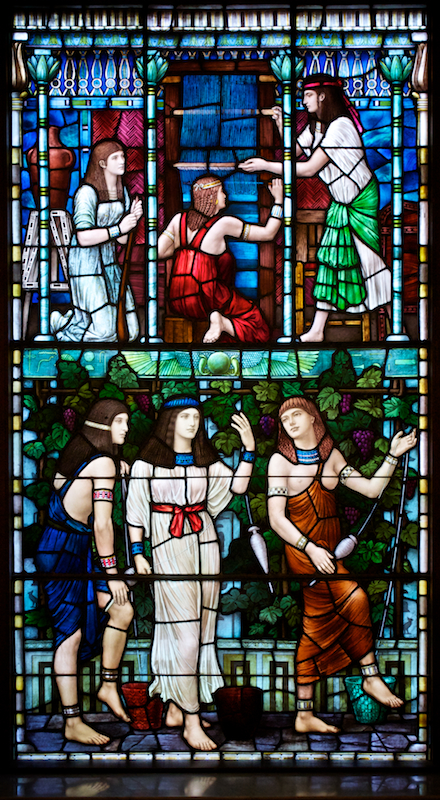 We are told that "the theme of domestic arts relates to the function" of the building, and thus, "the three panels of the window are devoted respectively to the culinary arts on the north, the textile manufacture arts in the center and the clothing care arts to the south. Each panel is divided into an upper and lower section; while the lower scenes render outdoor activities, those on the upper level appear to be indoors, as indicated by a series of lotiform colums supporting a roof".