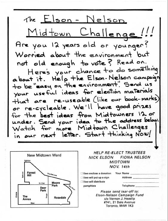 Two unusual twists here—two candidates running a joint campaign, and reaching out to youth who won’t be eligible to vote for years. The Nelson-Elson campaign for School Trustee in the new Midtown ward in 1988.