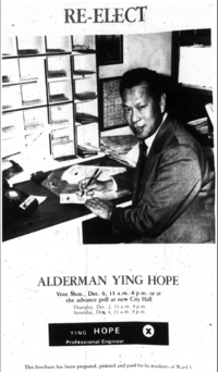 Ying Hope served Ward 5 in the old city of Toronto as a School Board Trustee (1963-1969), then as Alderman from 1969-1985. In later years he worked on environmental issues, and helped to win redress from the Canadian Government for the Chinese head tax levied in the nineteenth and early twentieth centuries.