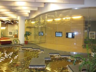 As you enter the library, sit by the quiet waters of the entrance or visit the TD Gallery–behind the glass wall in this photo.