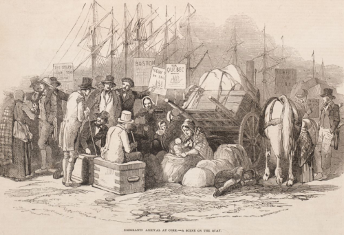 In the 1850s, thousands of Irish emigrants departed for British North America each week. This image comes from an Illustrated London News article illustrating the journey from the emigration agent’s office, to the bustling quay at Cork to the cramped quarters on ships bound for New York, Boston and Quebec. Mass emigration from Ireland was fuelled by the devastating effects of the Great Famine.